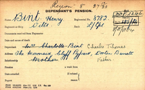 Henry was born 13 October 1893 Inkpen, Hungerford, Berkshire. His father was Charles Bint (a general labourer born in Essex) and his mother Charlotte Blint. His siblings at the 1901 census were Walter (born 1886), Ellen, Edith, Sidney (born 1896) and Herbert (born 1900). Indicative of their traveller lifestyle the children were born variously in Hampshire, Wiltshire, Berkshire and Somerset.