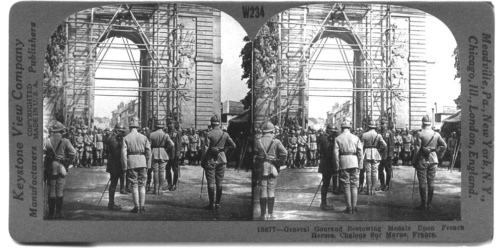 Image Id: 1050 Contributor: The Jordan/Ference Collection Theatre: Western Front Subject: Parades Location: Chalons sur Marne, Grand Est, France Regiment: Unknown Service Arm: Infantry Battle: Unknown Date: Unknown Combatants: French Publisher: Keystone View Co Source: American Directory: 18600-18699