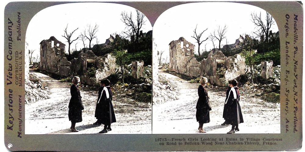 French Girls Looking at Ruins in Village Courteass on Road to Belleau Wood, near Chateau-Thierry, France
