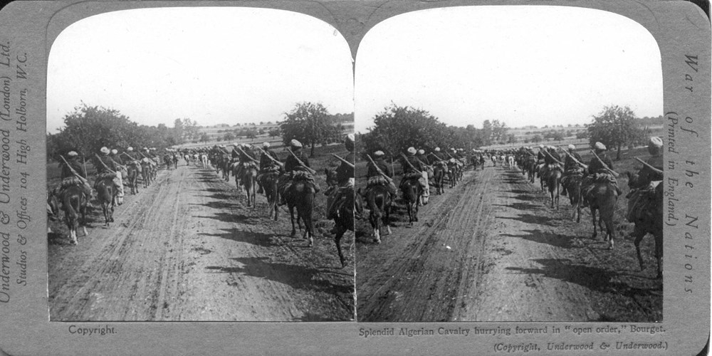 Image Id: 114 Contributor: The Jordan/Ference Collection Theatre: Western Front Subject: Behind the Lines Location: Bourget, France Regiment: Unknown Service Arm: Cavalry Battle: Unknown Date: Unknown Combatants: French (Algerian) Publisher: Underwood & Underwood Source: British Directory: WOTNB