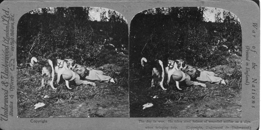 The dog in war. He takes steel helmet of wounded soldier as a sign when bringing help