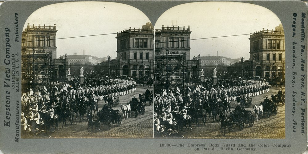 Not from a WWI set, but related to 10331 & 10332Image Id: 1156 Contributor: The Jordan/Ference Collection Theatre: Pre-War Subject: Parades Location: Berlin, Germany Regiment: Unknown Service Arm: Infantry Battle: Unknown Date: Unknown Combatants: German Publisher: Keystone View Co Source: American Directory: 00001-17999