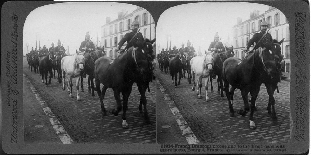 French Dragoons proceeding to the Front, each with spare horse, Bourget, France