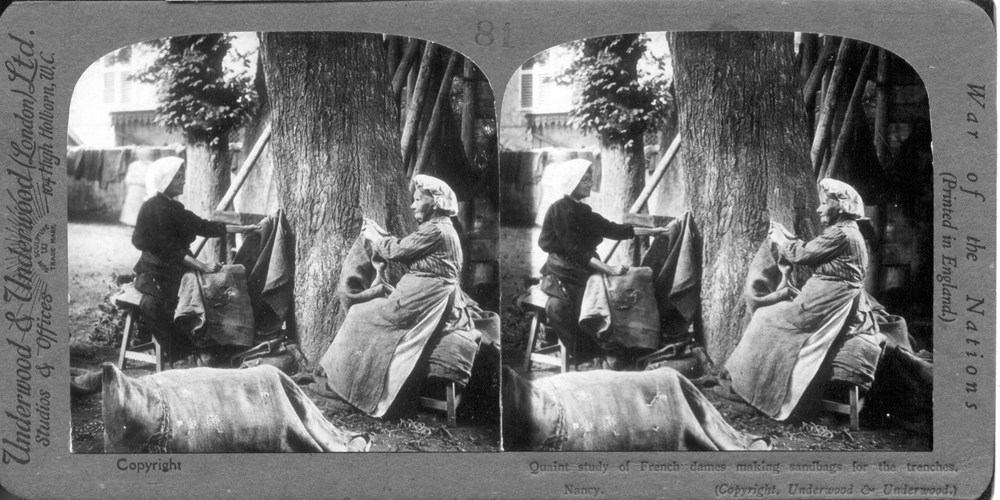 Quaint study of French dames making sandbags for the trenches, Nancy