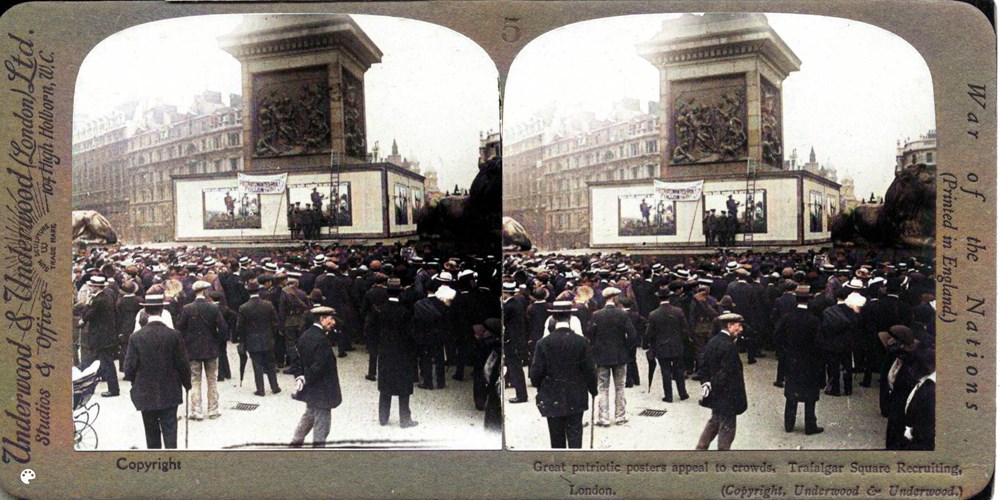 Great patriotic posters appeal to crowds, Trafalgar Square Recruiting, London