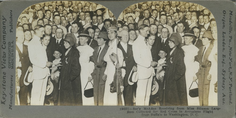 Sec'y. McAdoo Receiving from Miss Stinson Large Sum Collected for Red Cross in Aeroplane Flight from Buffalo to Washington, D.C.