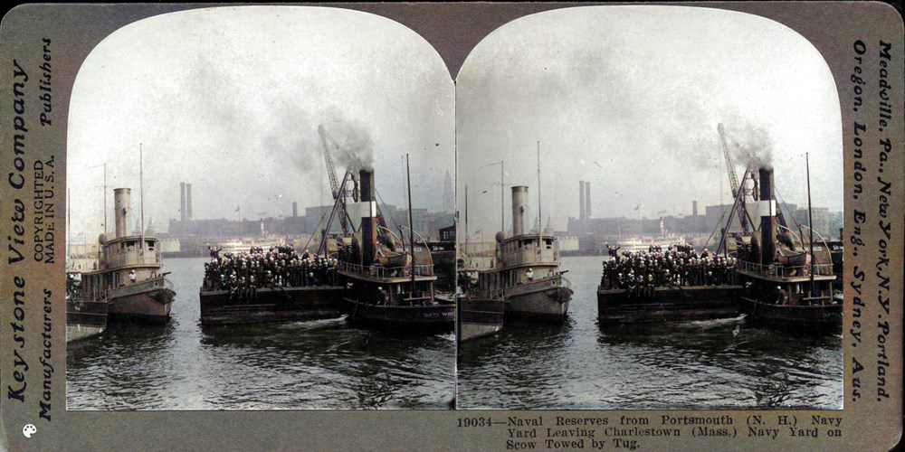 Naval Reserves from Portsmouth (N.H.) Navy Yard Leaving Charlestown (Mass.) Navy Yard on Scow Towed by Tug