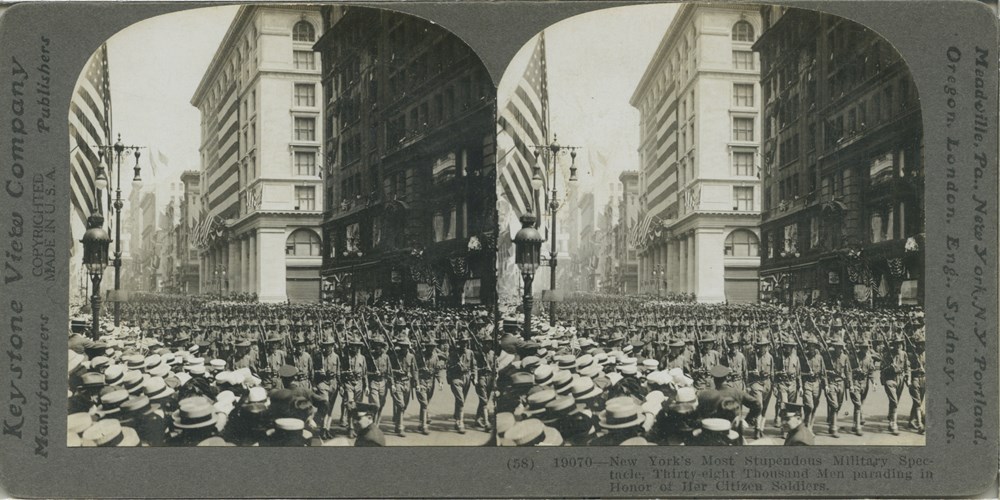 Image Id: 1272 Contributor: The Jordan/Ference Collection Theatre: Home Front Subject: Parades Location: New York, USA Regiment: Unknown Service Arm: Infantry Battle: Unknown Date: Unknown Combatants: Unknown Publisher: Keystone View Co Source: American Directory: 19000-19099