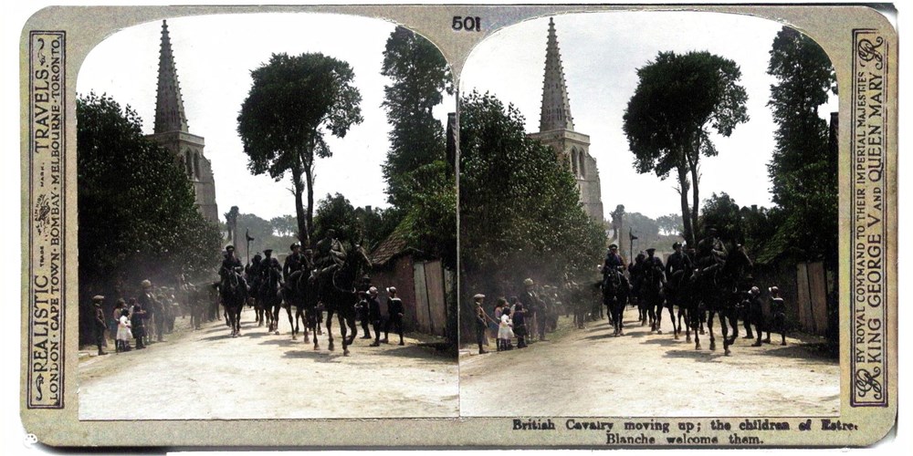 British Cavalry moving up; the children of Estre-Blanche welcome them