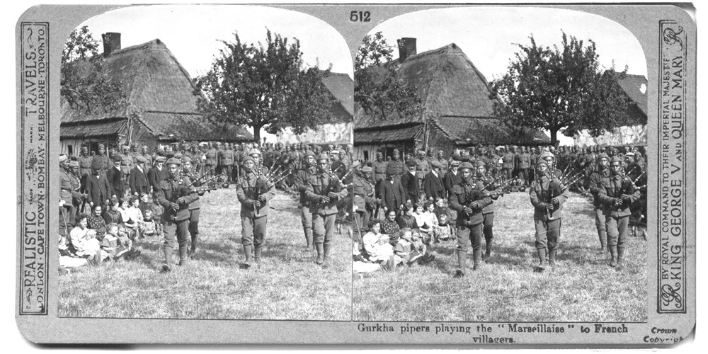Gurkha pipers playing the "Marseillaise" to French villagers