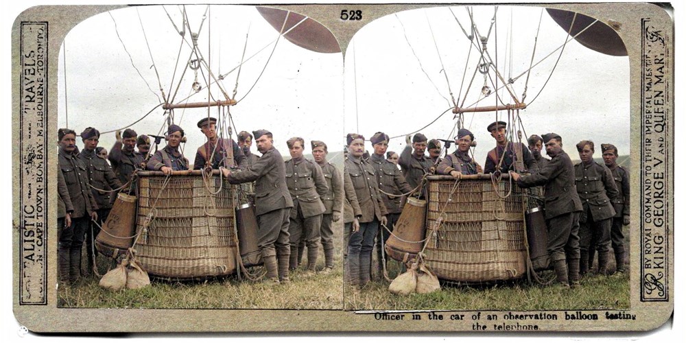 Officer in the car of an observation balloon testing the telephone