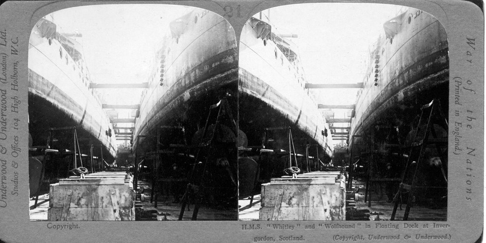 Image Id: 133 Contributor: The Jordan/Ference Collection Theatre: The High Seas Subject: Surface Vessels Location: Invergordon, Scotland Regiment: HMS Whitley, HMS Wolfhound Service Arm: Navy Battle: Unknown Date: Unknown Combatants: British Publisher: Underwood & Underwood Source: British Directory: WOTNB