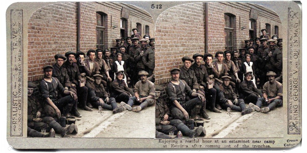 Enjoying a restful hour at an estaminet near camp at Estaires after coming out of the trenches