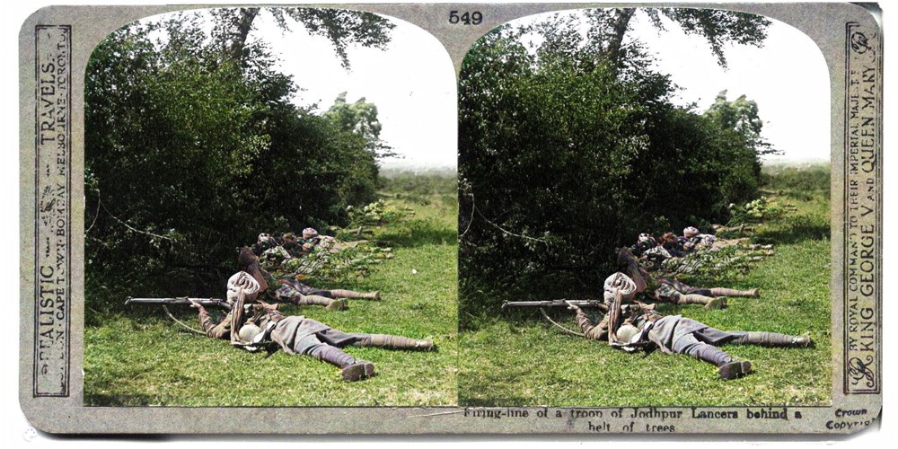 Firing-line of a troop of Jodhpur Lancers behind a belt of trees