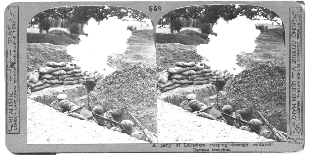 A party of Leicesters creeping through captured German trenches