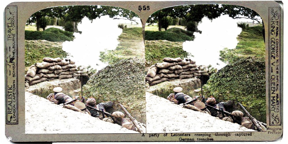 A party of Leicesters creeping through captured German trenches