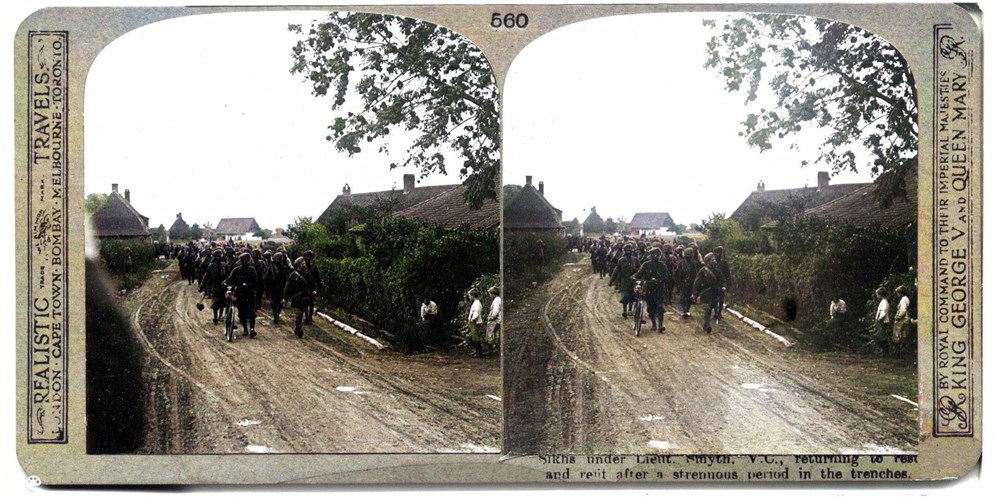 Sikhs under Lieut. Smyth, V.C., returning to rest and refit after a strenuous period in the trenches