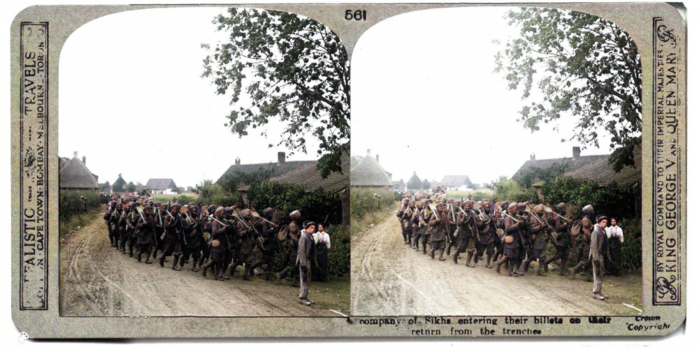 A company of Sikhs entering their billets on their return from the trenches