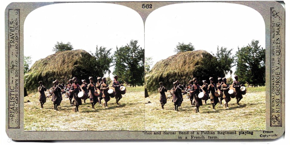 Dhol and Sarnai Band of a Pathan Regiment playing in a French farm