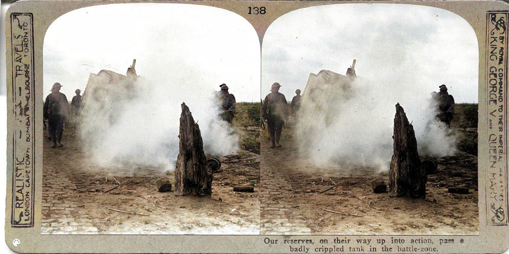 Our reserves, on their way up into action, pass a badly crippled tank in the battle zone