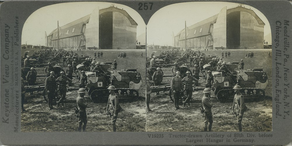 Tractor-drawn Artillery of 89th Div. Before Largest Hangar in Germany
