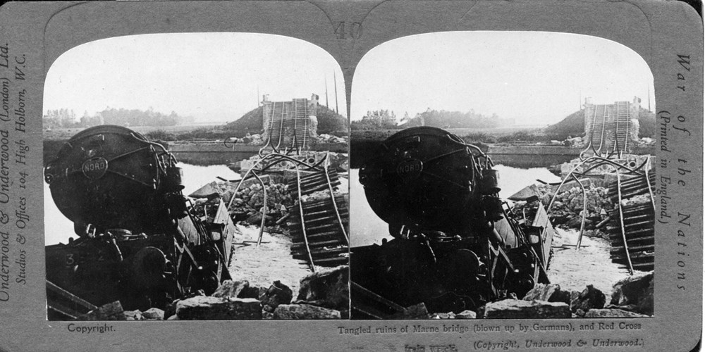 Tangled ruins of Marne bridge (blown up by Germans), and Red Cross train wreck