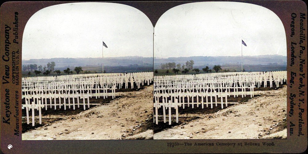 Image Id: 1432 Contributor: The Jordan/Ference Collection Theatre: Western Front Subject: Cemeteries & Monuments Location: Belleau Wood, France Regiment: Unknown Service Arm: Unknown Battle: Unknown Date: Unknown Combatants: Unknown Publisher: Keystone View Co Source: American Directory: 19200-19299