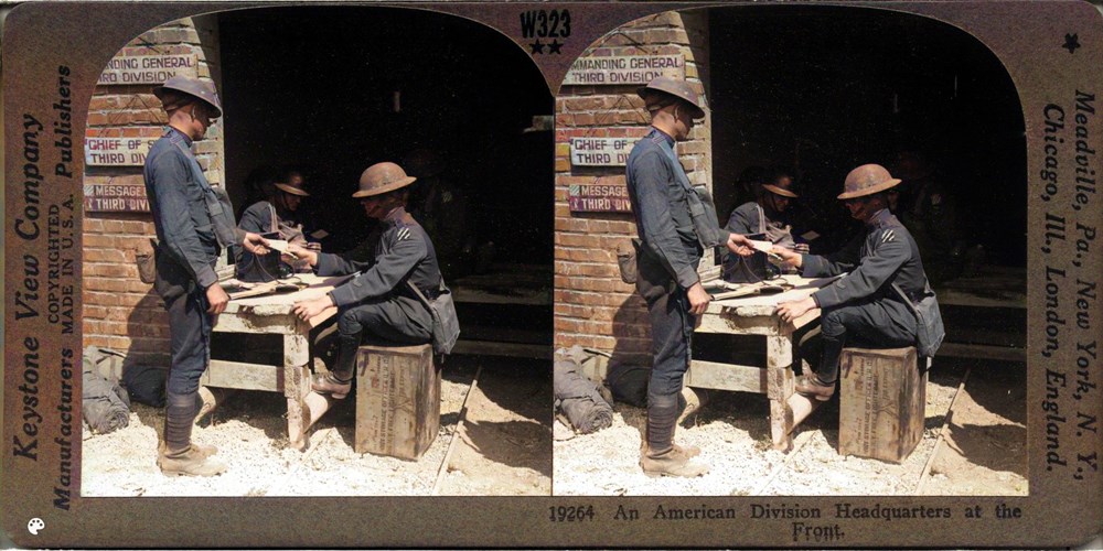 Image Id: 1446 Contributor: The Jordan/Ference Collection Theatre: Western Front Subject: The Front Line Location: Unknown Regiment: 3rd Division HQ Service Arm: Infantry Battle: Unknown Date: Unknown Combatants: American Publisher: Keystone View Co Source: American Directory: 19200-19299