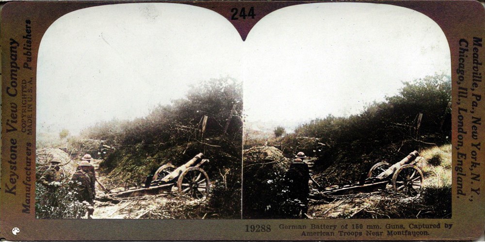 Image Id: 1469 Contributor: The Jordan/Ference Collection Theatre: Western Front Subject: War Booty Location: Montfaucon, France Regiment: Unknown Service Arm: Field Artillery Battle: Unknown Date: Unknown Combatants: German/American Publisher: Keystone View Co Source: American Directory: 19200-19299