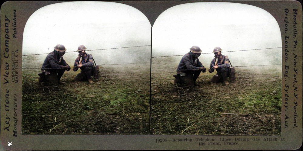 Repairing Telephone Lines During Gas Attack at the Front, France