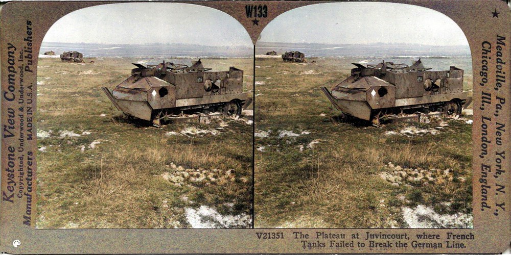 Image Id: 1555 Contributor: The Jordan/Ference Collection Theatre: Western Front Subject: The Front Line Location: Juvincourt, France Regiment: Unknown Service Arm: Tanks/Armoured Cars Battle: Unknown Date: Unknown Combatants: French Publisher: Keystone View Co Source: American Directory: 20000 Plus