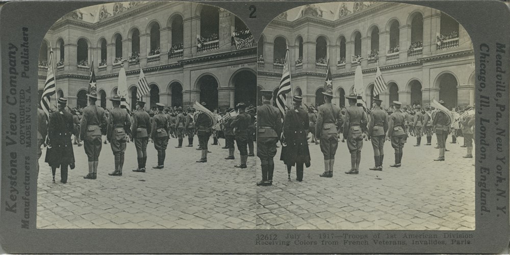July 4, 1917 - Troops of 1st American Division Receiving Colors from French Veterans, Invalides, Paris.