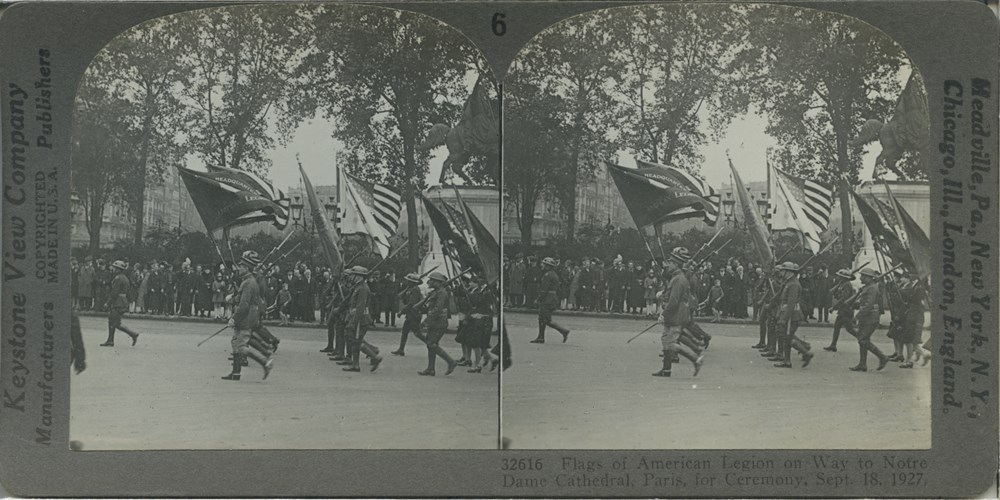 Flags of American Legion on Way to Notre Dame Cathedral, Paris, for Ceremony, Sept. 18, 1927.