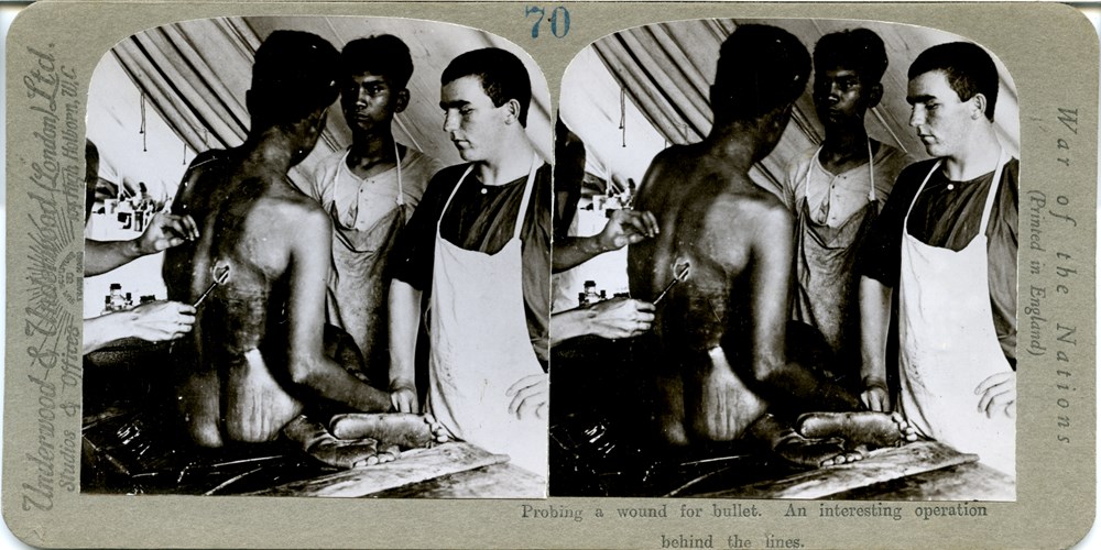 Image Id: 165 Contributor: The Jordan/Ference Collection Theatre: Africa Subject: Medical Scenes Location: East Africa Regiment: Unknown Service Arm: Medical Services Battle: Unknown Date: Unknown Combatants: British,Indian Publisher: Underwood & Underwood Source: British Directory: WOTND