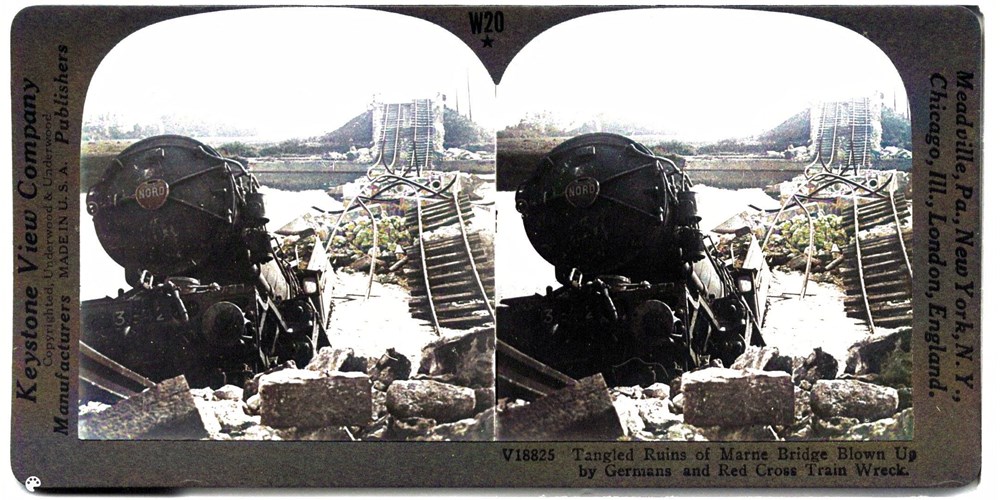 Tangled Ruins of Marne Bridge Blown Up by Germans and Red Cross Train Wreck