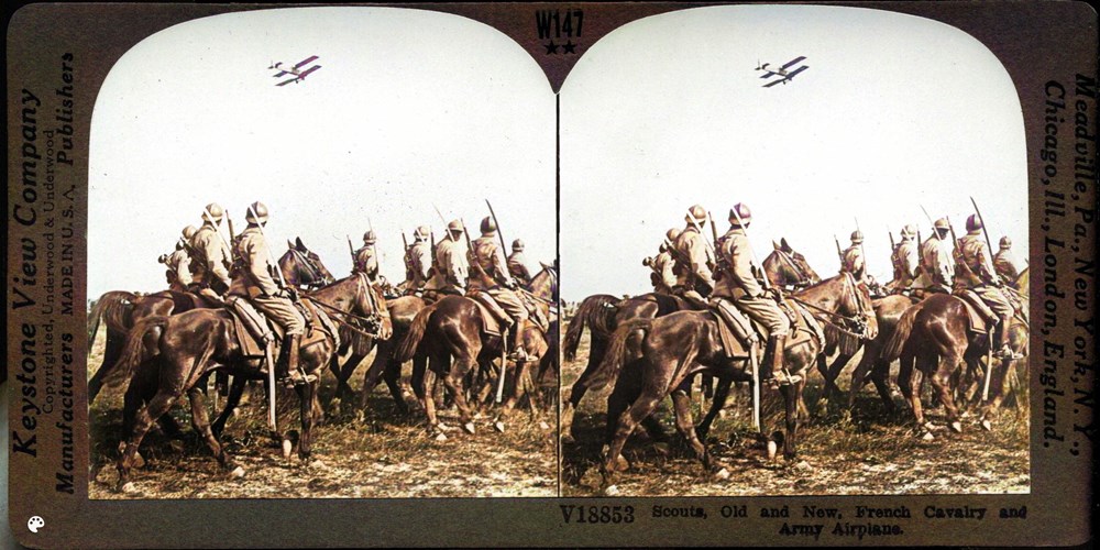 Deliberately contrasts old and modern warfareImage Id: 1682 Contributor: The Jordan/Ference Collection Theatre: Western Front Subject: Aircraft Location: France Regiment: Unknown Service Arm: Cavalry Battle: Unknown Date: Unknown Combatants: French Publisher: Keystone View Co Source: American Directory: 18800-18899