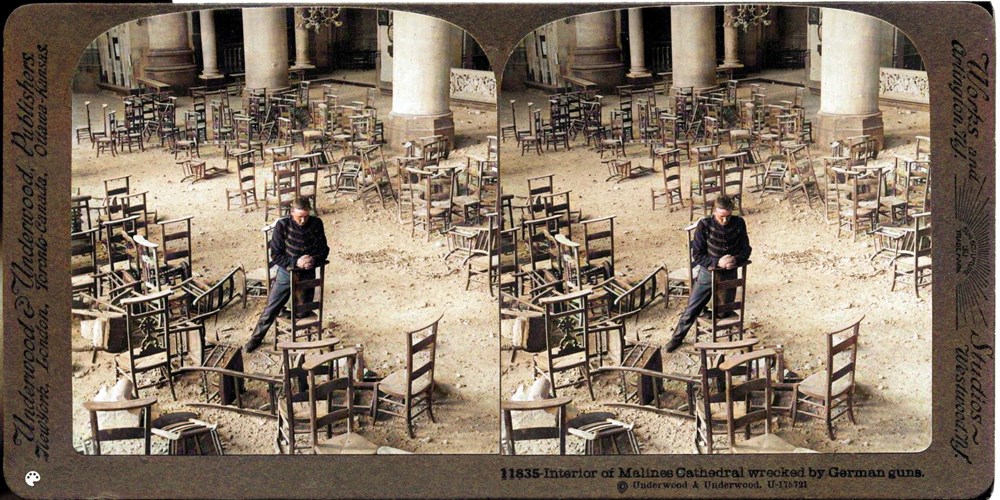 Image Id: 1715 Contributor: The Jordan/Ference Collection Theatre: Western Front Subject: Battle Aftermath Location: Malines Cathedral, Belgium Regiment: Unknown Service Arm: Unknown Battle: Unknown Date: Unknown Combatants: Belgian Publisher: Underwood & Underwood (American) Source: American Directory: 0-11900