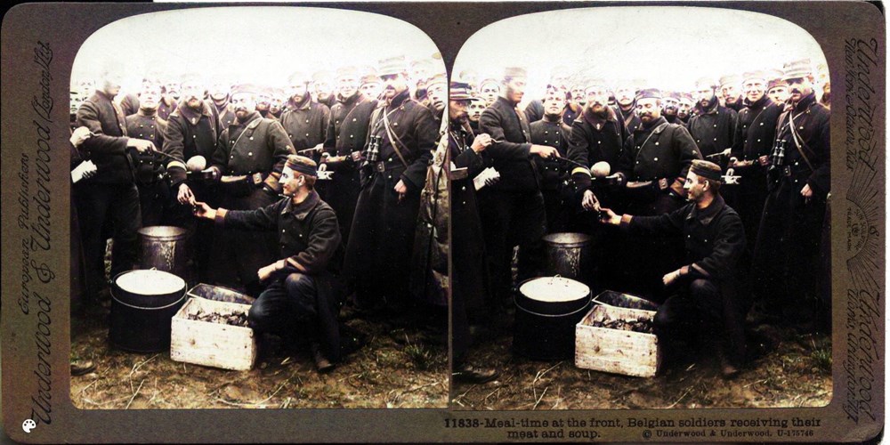 Meal-time at the front, Belgian soldiers receiving their meat and soup