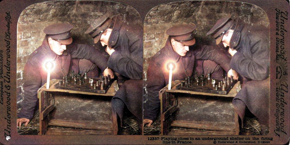 Playing chess in an underground shelter on the firing line in France