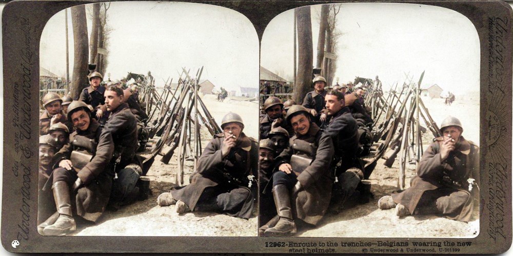 Enroute to the trenches--Belgians wearing the new steel helmets
