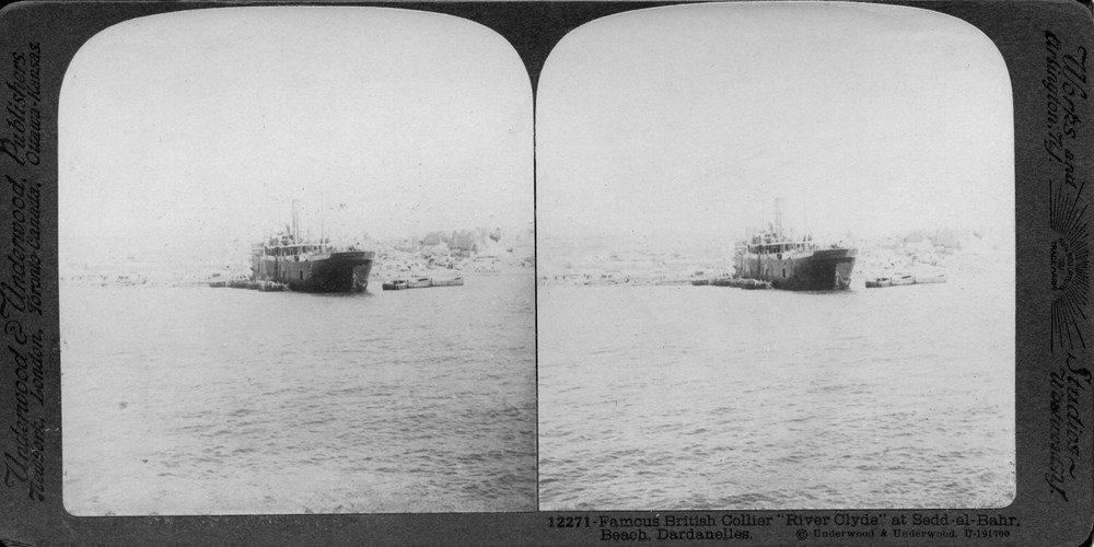 Image Id: 1839 Contributor: The Jordan/Ference Collection Theatre: Gallipoli Subject: Surface Vessels Location: Sedd-el-Bahr Regiment: Collier, River Clyde Service Arm: Navy Battle: Unknown Date: Unknown Combatants: British Publisher: Underwood & Underwood (American) Source: American Directory: 12248-13068