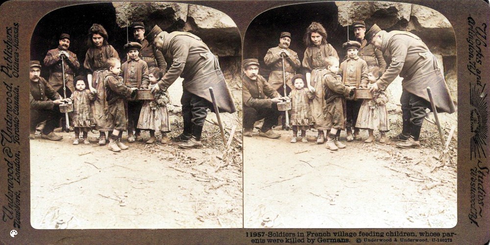 Soldiers in French village feeding children, whose parents were killed by Germans