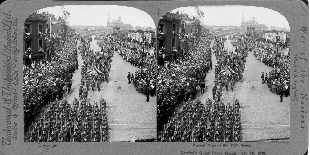 Image Id: 185 Contributor: The Jordan/Ference Collection Theatre: Post-War Subject: Parades Location: London Regiment: Unknown Service Arm: Unknown Battle: Unknown Date: July 1919 Combatants: American Publisher: Underwood & Underwood Source: British Directory: London Peace March
