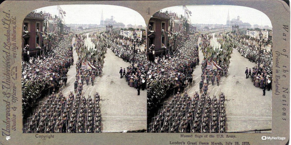 Image Id: 185 Contributor: The Jordan/Ference Collection Theatre: Post-War Subject: Parades Location: London Regiment: Unknown Service Arm: Unknown Battle: Unknown Date: July 1919 Combatants: American Publisher: Underwood & Underwood Source: British Directory: London Peace March