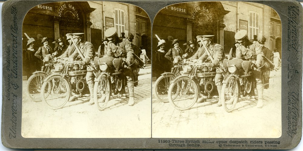 Three British motor cycle despatch riders passing through Senlis