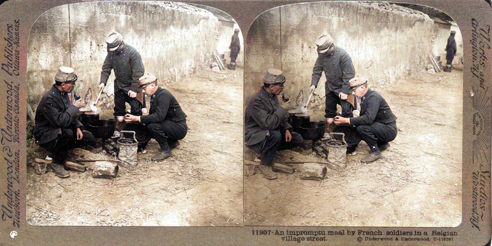 An impromptu meal by French soldiers in a Belgian village street
