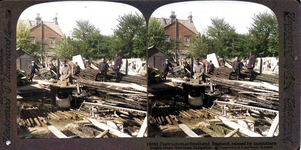 Image Id: 1875 Contributor: The Jordan/Ference Collection Theatre: Home Front Subject: Zeppelin & Bomber Raids Location: Southend, Essex Regiment: Unknown Service Arm: Unknown Battle: Unknown Date: Unknown Combatants: Unknown Publisher: Underwood & Underwood (American) Source: American Directory: 11901-12168
