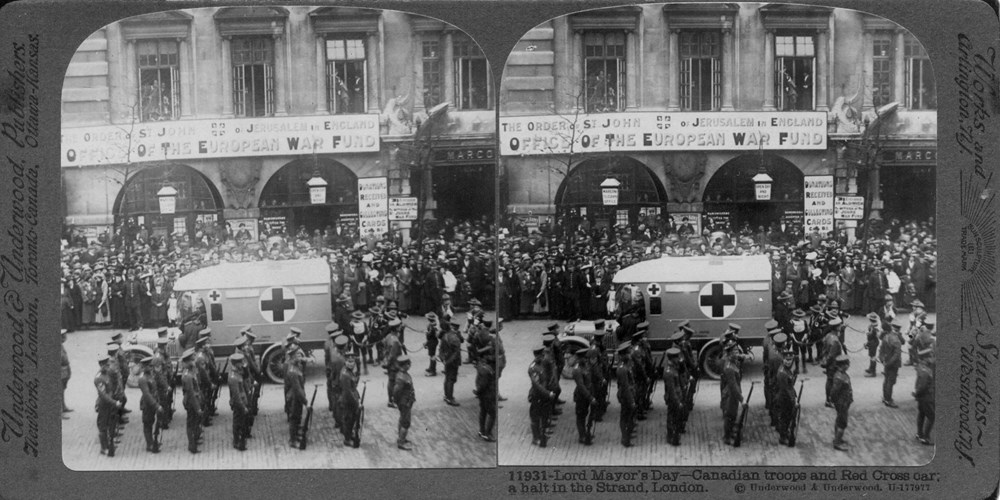 Lord Mayor's Day--Canadian troops and Red Cross car; a halt in the Strand, London