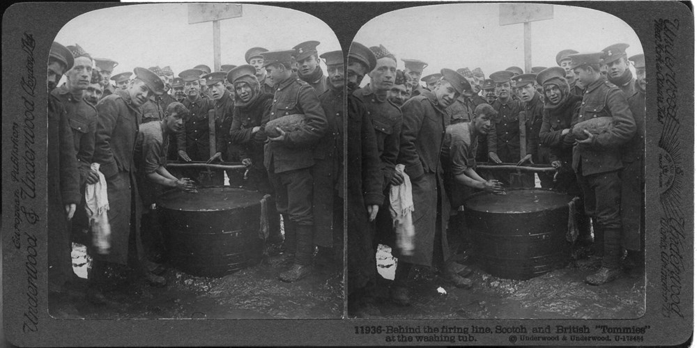 Behind the firing lines, Scotch and British "Tommies" at the washing tub