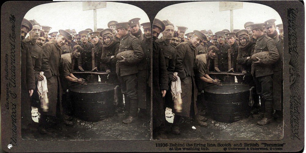 Behind the firing lines, Scotch and British "Tommies" at the washing tub